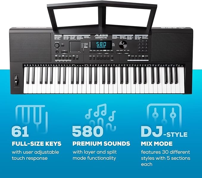 Electronic keyboard with 61 full-size keys, user adjustable touch response, pitch-bend wheel, X/Y performance touchpad, Mix mode with DJ-style FX, and 30 different styles with 5 sections each
