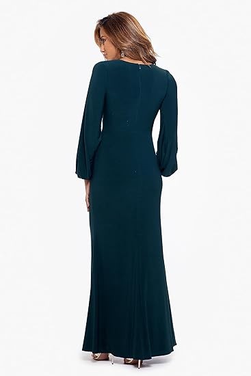 Details include: floor length, long elegant sleeve, high stretch material, V-neck wrap, knot on waist