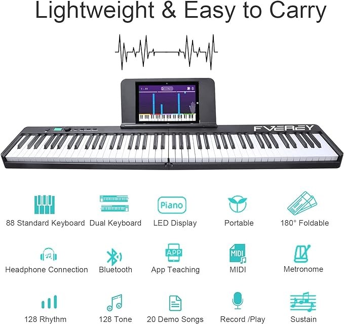 FVEREY Folding Piano Keyboard, 88 Key Semi Weighted Keyboards Electric Piano, Full Size Keyboard Portable Digital Piano with Sustain Pedal, Handbag, Bluetooth, USB MIDI for Beginner, Adult