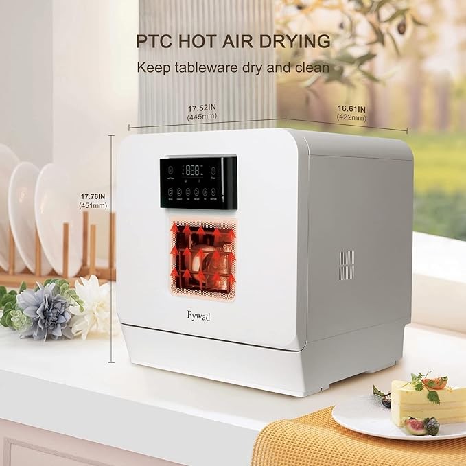 Fywad countertop dishwasher, portable dishwasher no hookup. Countertop Dishwasher with Water Tank. With child lock, hot drying, 4 washing programs. 360-degree spraying.