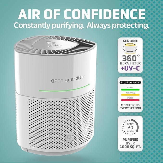 Germ Guardian AirSafe+ Intelligent Air Purifier with 360° HEPA 13 Filter, Captures 99.97% of Pollutants, Wildfire Smoke, Large Rooms, Air Quality Sensor, UVC Light, Zero Ozone Verified, White AC3000W