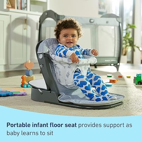 Portable infant floor seat provides support as baby learns to sit independently