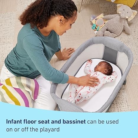 Portable bassinet converts to an infant floor seat and can be used both on or off the playard