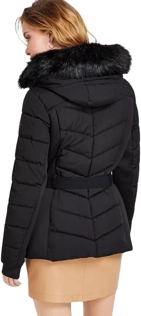 Michael Michael Kors Women's Faux Fur Hooded Puffer Scuba Belted Coat Jacket Black