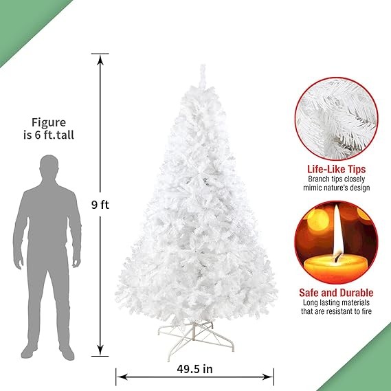 • 【Realistic Christmas Tree】The 9ft artificial Christmas tree equipped with 1850 white branch tips that creates a lush and natural appearance, it provides a generous amount of space for you to hang ornaments as well as other Christmas tree decor with your families and friends.