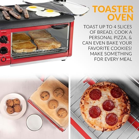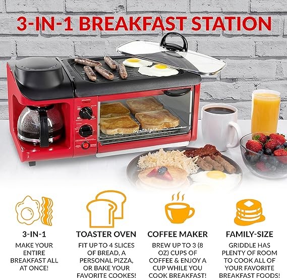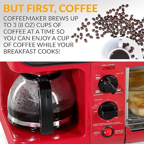 • ALL-IN-ONE BREAKFAST SOLUTION: Start your day off right with our versatile breakfast station. This 3-in-1 appliance includes a 3-cup coffee maker, a large griddle for cooking eggs, bacon, and pancakes, and a toaster oven that can hold up to four slices of bread.