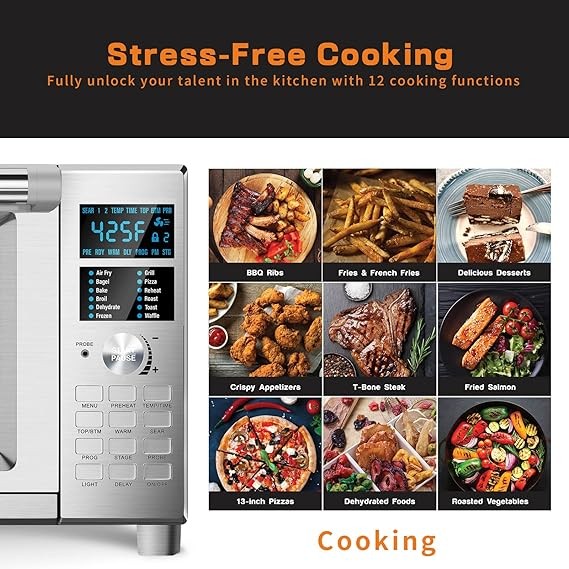 • UNBEATABLE TEMPERATURE CONTROL – The toaster oven combines conduction, convection and radiant heat to circulate and penetrate food with cyclonic hot air that ranges between 100°F and 450°F with precise 5°F increments. The digital temperaure probe virtually eliminate the possibility of over or under-cooking by measuring the internal temperature of your food while it cooks. This advanced probe will shut off the convection oven once your meat, seafood or poultry reaches a set temperature