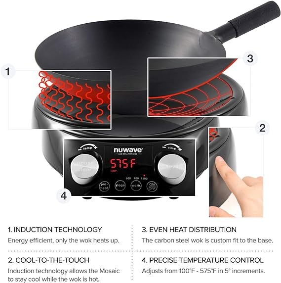 Nuwave Mosaic Induction Wok, Precise Temp Controls from 100°F to 575°F in 5°F, Wok Hei, Infuse Complex Charred Aroma & Flavor, 3 Watts 600, 900 & 1500, Authentic 14-inch Carbon Steel Wok Included