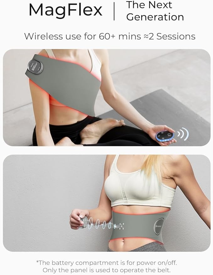 • CORDLESS DESIGN - Use the magnetic controller to customize sessions based on different needs, including pulse modes, optical densities and vibration. Outdoor wireless wear is also realizable thanks to its large capacity to power supply the belt.