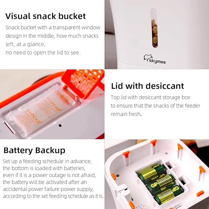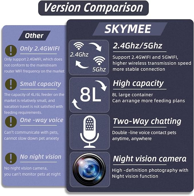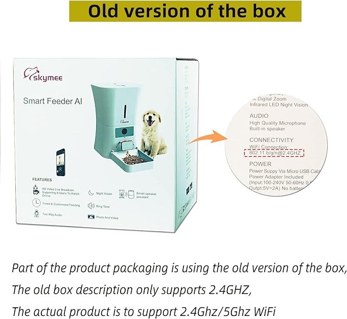 • MORE -- Skymee will alert you when it detects dog movements or food running low. Dual power supply system with external USB cable and 3 pieces D batteries (not included) to prevent power off. Please pay attention that skymee pet feeder can connect 2.4G WiFi and 5G WiFi.