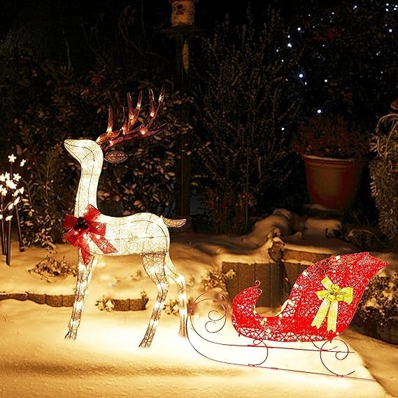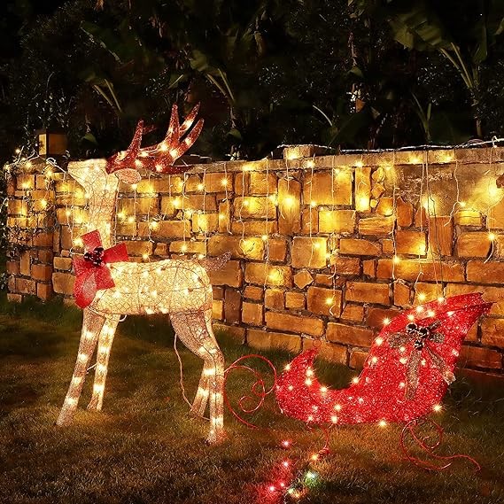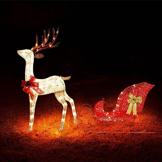 120 WARM WHITE LIGHTS: Reindeer and sleigh are adorned with 120 LEDs in total, evenly distribute throughout the whole internal surface of the item. When plugged on, it glows out bright warm white lights, and looks very charming and beautiful in the dark night.