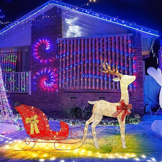 REINDEER PULLING SLEIGH: Zcaukya light up yard decoration is consisted of 2 parts: reindeer and sleigh. Reindeer measures 48" x 25.6" x 11.2", and the sleigh measures 35.4" x 22.8" x 15.6".
