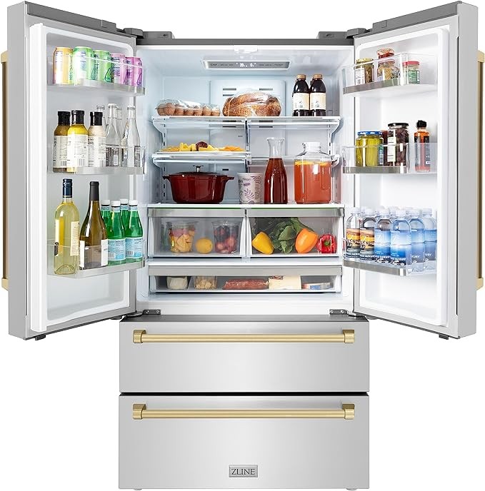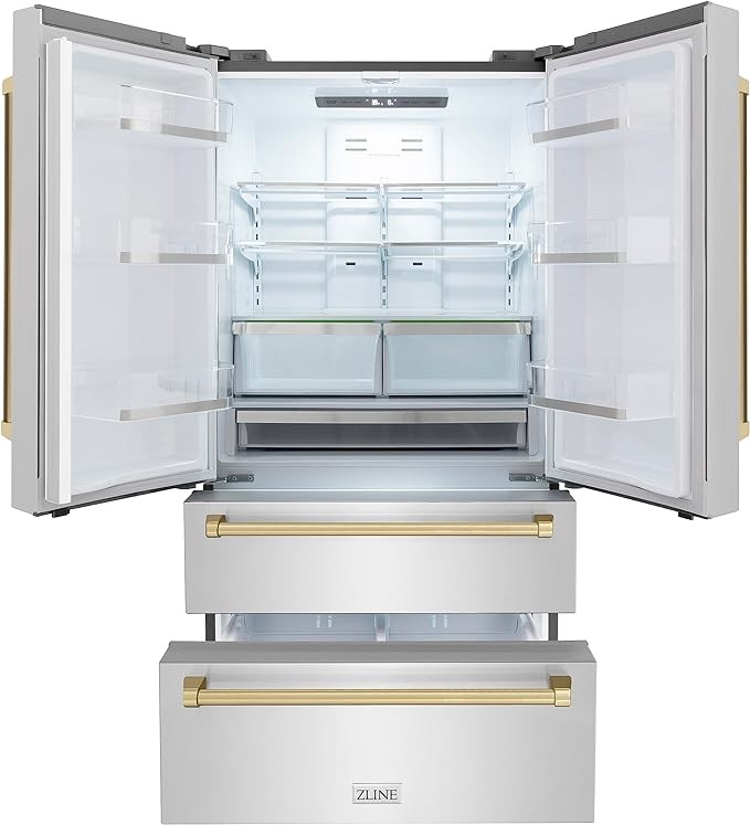 ZLINE 36" Autograph Edition 22.5 cu. ft Freestanding French Door Refrigerator with Ice Maker in Fingerprint Resistant Stainless Steel with Champagne Bronze Accents (RFMZ-36-CB)